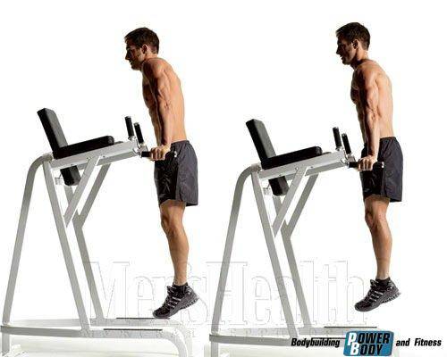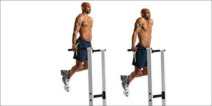 Займите исходное положение на брусьях. Руки выпрямлены, плечи опущены. Ноги можно слегка согнуть и скрестить. Не сгибая рук, опустите туловище вниз. Поначалу движение может не получаться, так как вам будет хотеться согнуть руки. Поэтому я рекомендую начинать с занятий на скамье. Не опускайте туловище слишком низко, трапеции и зубчатая мышца должны быть в напряжении! Плавным движением вытолкните туловище вверх до исходного положения.