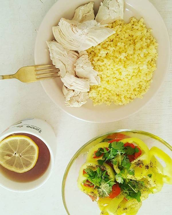 - Отварной неочищенный рис, порция диетического куриного суфле, салат из капусты, заправленный любым растительным маслом. Не забывайте про коричневый рис — источник клетчатки и медленных углеводов.