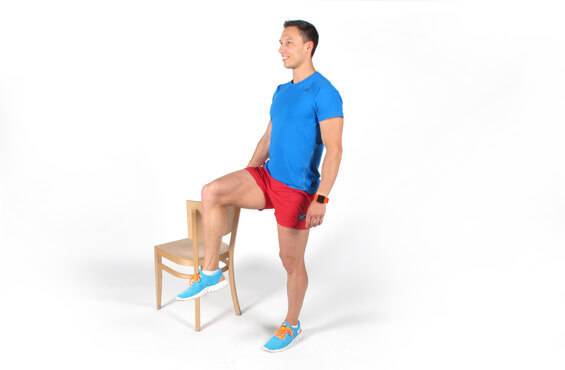 Исходное положение: на одной ноге, вторая — впереди на весу, согнута в колене. Рукой держитесь за стул.