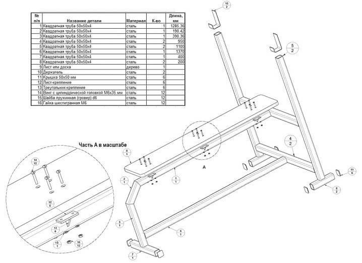 Проект выбран, чертежи составлены. Осталось подобрать необходимые материалы и приступить к работе. Для изготовления штанговых стоек и опоры скамеек требуется металлический профиль. Гриф штанги делают из металлической трубы, разделители – из двух прочных болтов или металлических пластин. Замки для грифа представляют собой готовые пружинные замки, но их можно сделать самостоятельно из 2-х кусков трубы. В каждом надо просверлить отверстие и закрепить болтом.