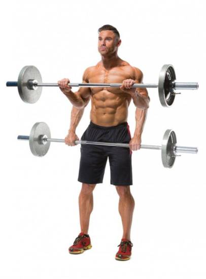 - Берем гриф (располагаем руки рядом или же на ширине плеч, от чего зависит выбор прямого или изогнутого спортивного инвентаря).