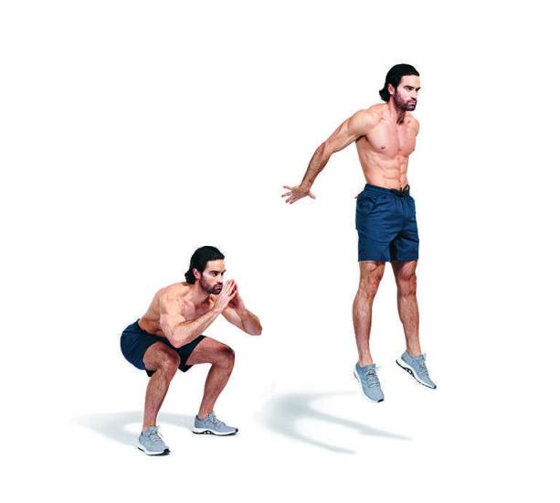 Добавление прыжка делает обычное приседание не только хорошим движением для наращивания мышечной массы, но и отличным кардио-упражнением для сжигания жира. Держа спину прямой, приседаем до тех пор, пока бедра не будут параллельны полу, а ягодичные мышцы на уровне колен (A), затем делаем прыжок вверх (B). Мягко приземляемся и приступаем к следующему повтору.
