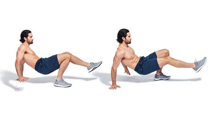 Это упражнение не из легких. Для удержания баланса мышц здесь придется очень сильно потрудиться. Сначала садимся на пол, держа руки за спиной, а ноги впереди себя. Теперь поднимаем бедра (A) и двигаемся вперед (B). После полминуты выполнения этого упражнения делаем отдых на 30 секунд, после чего опять приступаем к первому упражнению — приседаниям с прыжками.
