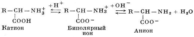 Обладая амфотерными свойствами (см. Амфолиты), аминокислоты в растворах диссоциируют как по типу кислотной диссоциации (отдавая ион водорода и заряжаясь при этом отрицательно), так и по типу щелочной диссоциации (присоединяя Н-ион и освобождая ион гидроксила), приобретая при этом положительный заряд. В кислой среде усиливается щелочная диссоциация аминокилот и происходит образование солей с анионами кислот. В щелочной среде, наоборот, аминокислоты ведут себя как анионы, образуя соли с основаниями. Установлено, что Аминокислоты в растворах практически полностью диссоциируют и находятся в виде амфотерных (биполярных) ионов, называемых также цвиттерионами или амфиионами: