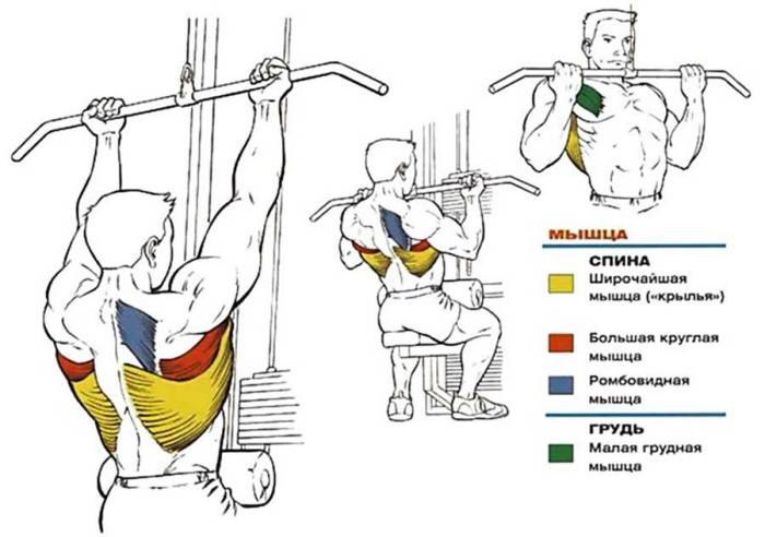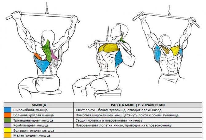 Основной работающей мышечной группой при выполнении тяги верхнего блока сидя являются широчайшие мышцы спины. однако в зависимости от типа рукоятки и ширины ее хвата существенно меняется то, какие вторичные мышцы принимают на себя дополнительную нагрузку.