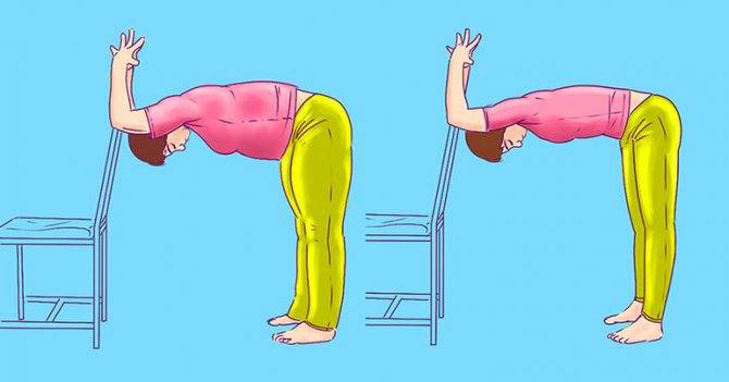 Перед выполнением выпей 100–200 мл теплой воды. Выбери опору — невысокий стол или стул. Обопрись локтями на спинку, как показано на картинке или согнись, разместив ладони на сиденье стула. Высоту опоры выбирай так, чтобы тебе было максимально комфортно, а позвоночник согнут. Можешь выполнять упражнение опираясь на стену.