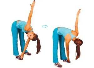 - начинается упражнение с вращательных движений туловища из стороны в сторону, при этом одна рука должна тянуться к носку противоположной ноги, а другая — заноситься над головой;