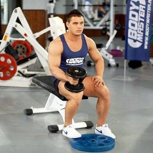 Аналогичное упражнение на подъёмы носков, но уже в положении сидя и с дополнительным весом — это более сложный уровень, который часто используется спортсменами и атлетами в тренажёрных залах. А сложность его заключается в том, чтобы только силой икроножных мышц поднимать отягощение, размещённое на коленях. Для выполнения упражнения вам понадобится стул или скамья и дополнительный вес, в качестве которого подойдут: гантели, гиря, диски от штанги, большая бутылка с водой, книги, гриф, бодибар и др.