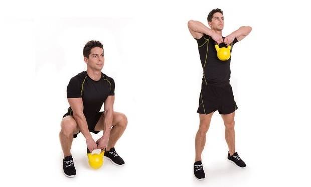 Выбросы с гирей представляют собой гоблет-приседание с выжиманием снаряда над головой одновременно с подъемом.