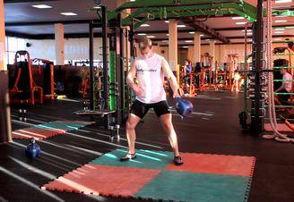 - На счет «три» уже левая нога отводится назад, правая сгибается в колене под прямым углом, а левая рука перекидывает гирю в правую. Напряжение тем временем координируется на ягодице и задней поверхности бедра левой ноги.