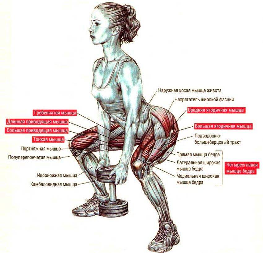 Основные движители в упражнении – весь массив ягодичных, квадрицепсы, и бицепсы бедер. Бицепсы бедер и ягодицы включаются приоритетно. Работает и длинная мышца спины, говорить, что тут не работает спина нельзя.