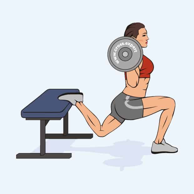 - Положите штангу на плечи и встаньте спиной вперед перед скамьей, коробкой для прыжков или другим аналогичным снарядом. Высота снаряда должна быть чуть ниже колена. Поставьте одну ногу на скамью. Чем дальше передняя нога будет отодвинута от скамьи, тем сильнее будут работать бицепс бедра и ягодичные мышцы. Чем расстояние меньше, тем сильнее будет нагружаться квадрицепс. Если поставить ногу ровно, то нагрузка будет попадать в переднюю часть бедра, если развернуть под 45 или чуть больше градусов, в работу включаться и приводящие мышцы бедра. Спину держим вертикально прямо, стараемся не делать даже маленького наклона вперед. Спина должна быть идеально прямая, грудь подана немного вверх, взгляд направлен вперед.