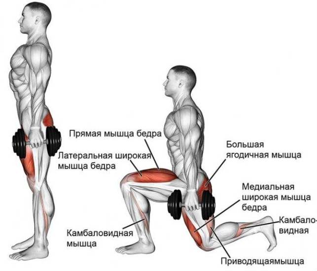 - если шаг сделать шире, а угол в колене опорной ноги станет больше 90 градусов, тогда большая часть нагрузки достанется ягодичной мышце, что больше подходит для девушек, однако, чем больше выпад вперед, тем неудобнее возвращаться в исходную позицию;