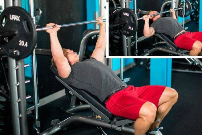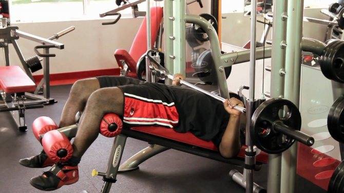 - Жим под углом в Смите. Для отработки техники движения или работы с большим весом, можно использовать этот тренажер.