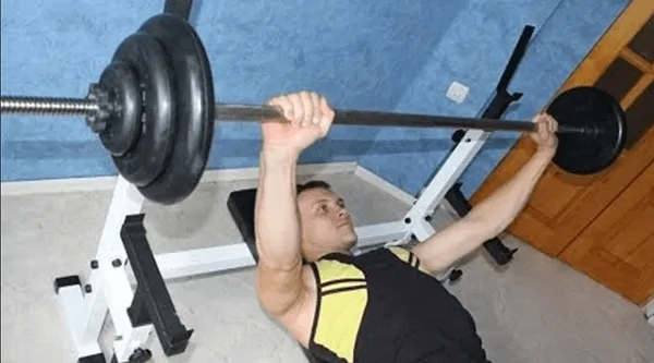 - Занять на спортскамье стартовую позицию: расположиться горизонтально на скамье, лицо направить вверх, ноги твёрдо зафиксировать на напольном покрытии. Гриф должен размещаться на уровне переносицы.